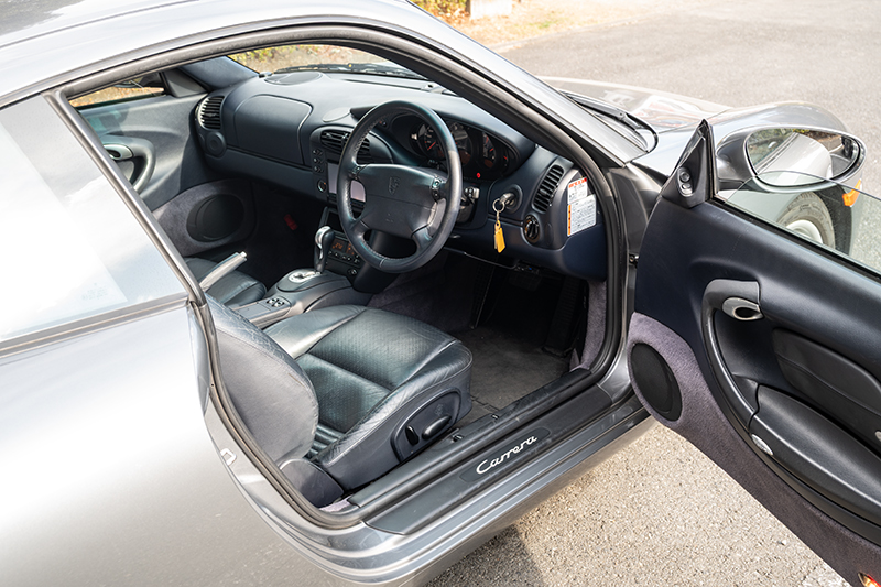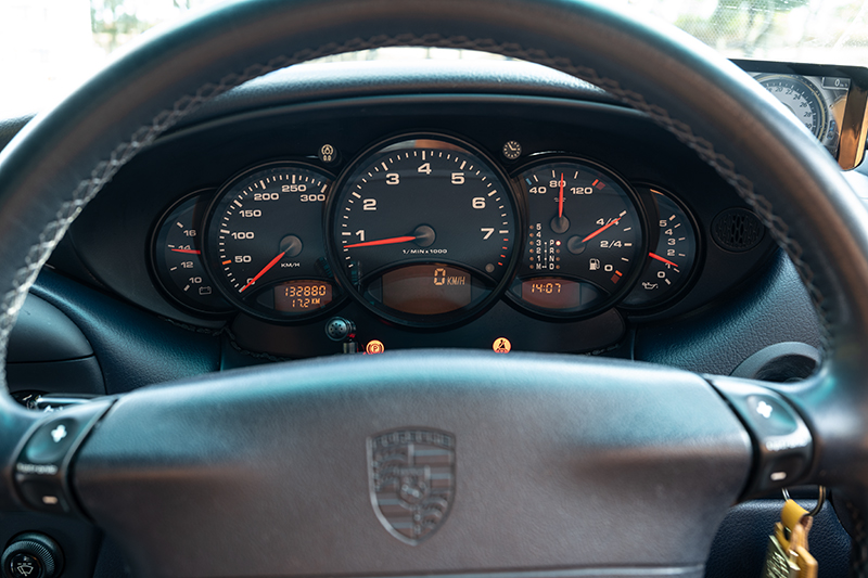 内装は黒に近いネイビーな感じ。ステアリングは993でも採用されていた4本スポークタイプ。