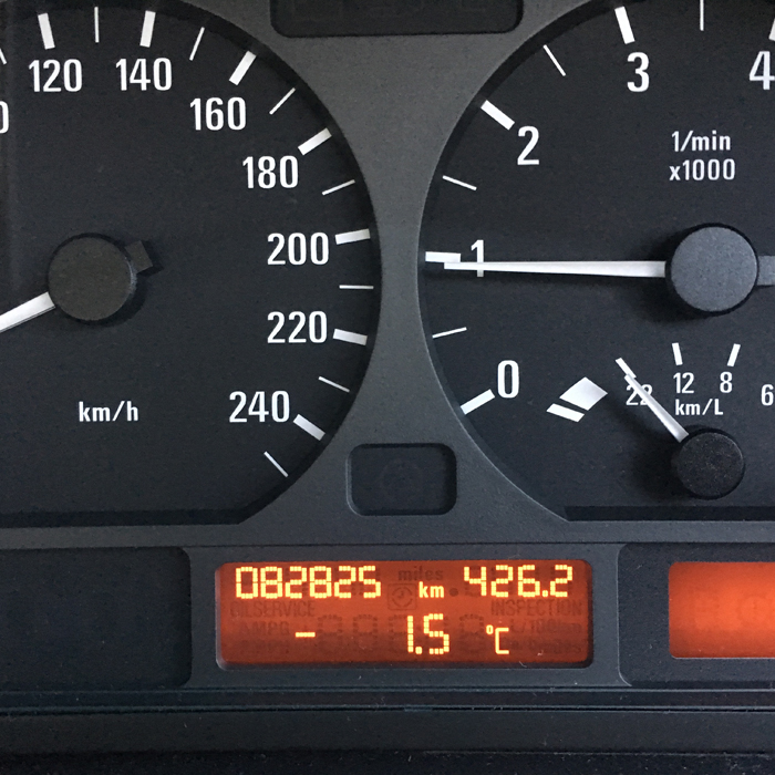 朝こんな感じです。この辺の地域にしてはかなり寒いです。 でもE46はシートヒーターがついているので、暖房が効くまでこれで辛抱できるのでとっても助かります。